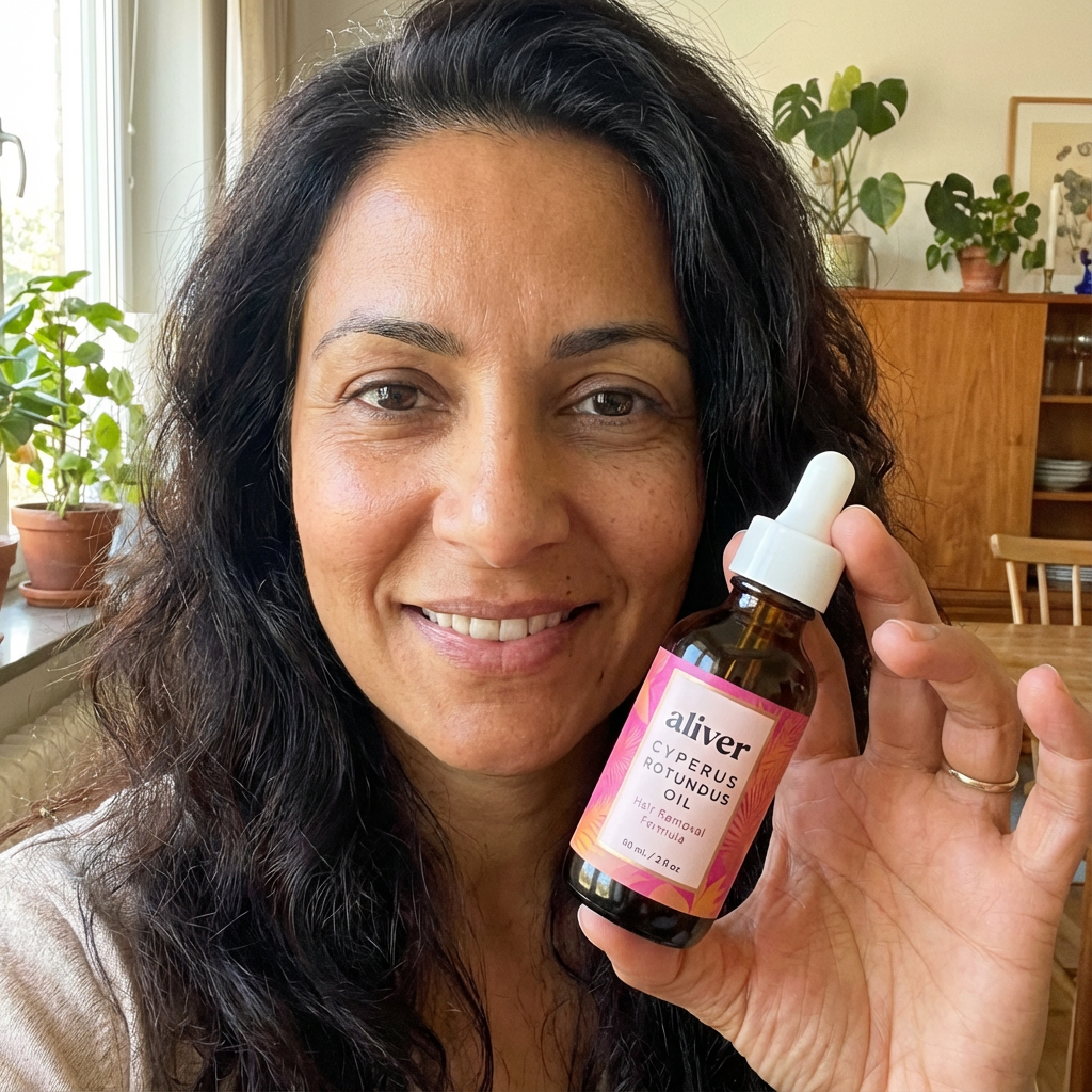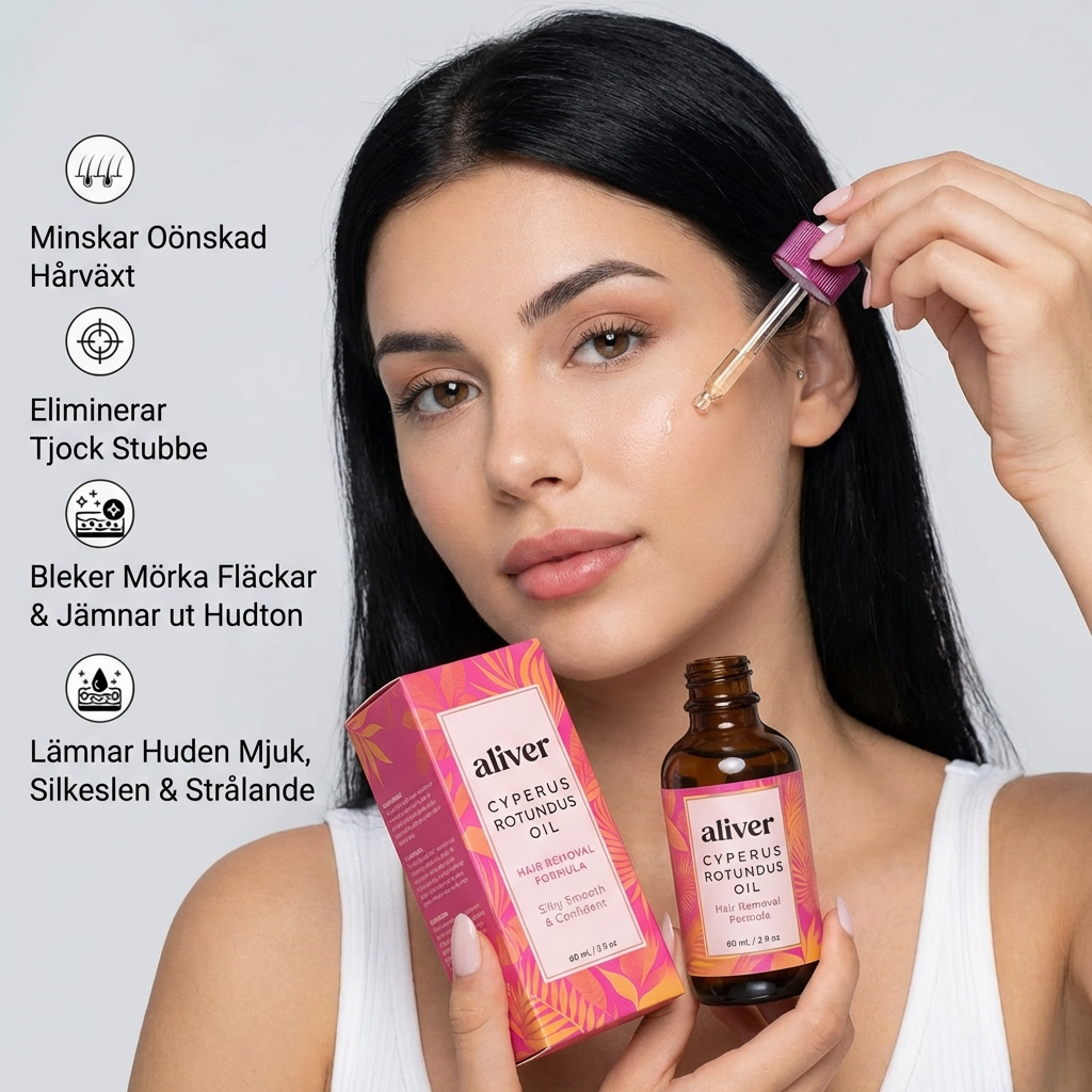 Cyperus Rotundus är en naturlig växtextrakt som i kliniska studier visat sig minska hårväxt med upp till 78%. Den fungerar genom att tränga in i hårcellen och hämma tillväxtfasen — så varje gång håret försöker växa tillbaka blir det svagare och tunnare.